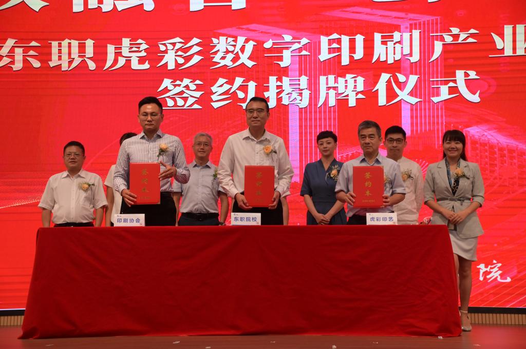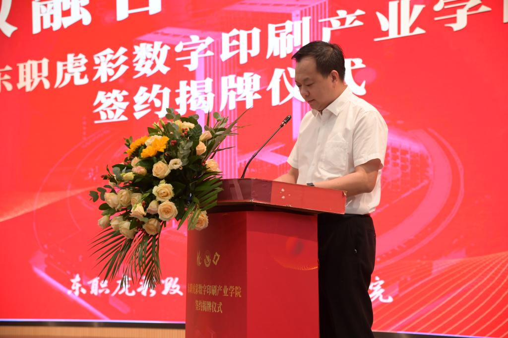 为推动“政校企”深度融合,解决东莞市印刷业高质量发展人才需求,9月21日上午,我校与虎彩印艺股份有限公司、东莞市出版印刷业协会三方合作共建的东职虎彩数字印刷产业学院正式签约。东莞市委宣传部副部长、市新闻出版局局长蔡国康,我校副校长刘海光,东莞市出版印刷协会会长殷植祺,虎彩集团董事长陈成稳出席签约仪式。市新闻出版局、虎门镇宣教文体旅游办相关负责人,市出版印刷业协会代表以及我校相关学院负责人等参加了签约仪式。