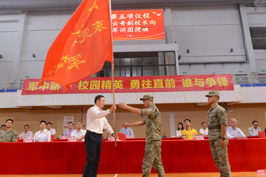 随后,杨云奇副校长向军训团授旗,军训团团长刘贵宾代表军训团接旗。杨云奇副校长宣布开营,2023级新生军训正式拉开大幕。
