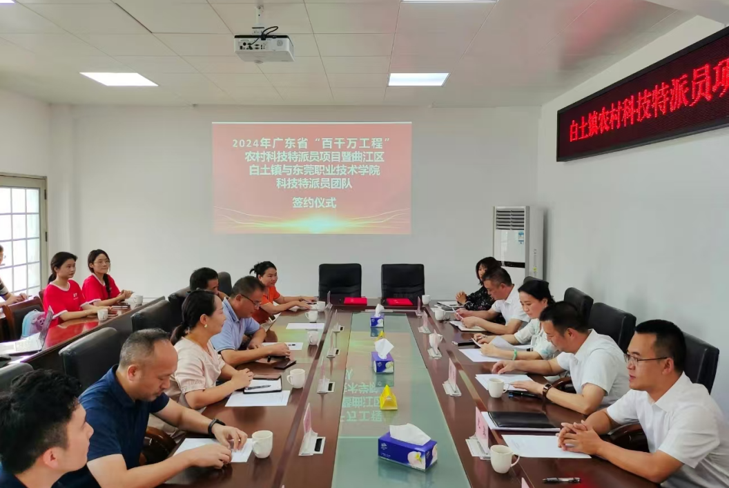 8月22日下午,我校现代工业创新实践中心(创业学院)充分发挥双创资源优势,组织农村科技特派员团队,赴韶关市曲江区白土镇,合作开展“百千万工程”项目签约和启动仪式。出席签约仪式的有曲江区委副书记、常平曲江对口帮扶协作工作队队长陈少锋、白土镇党委书记曹权、镇长李文雄、镇党委副书记尤其、镇党委委员陈福生、副镇长许伟恩、东莞驻白土镇帮镇扶村工作队队长邓锦棠,以及学校科技特派员团队。签约仪式由白土镇镇长李文雄主持。
