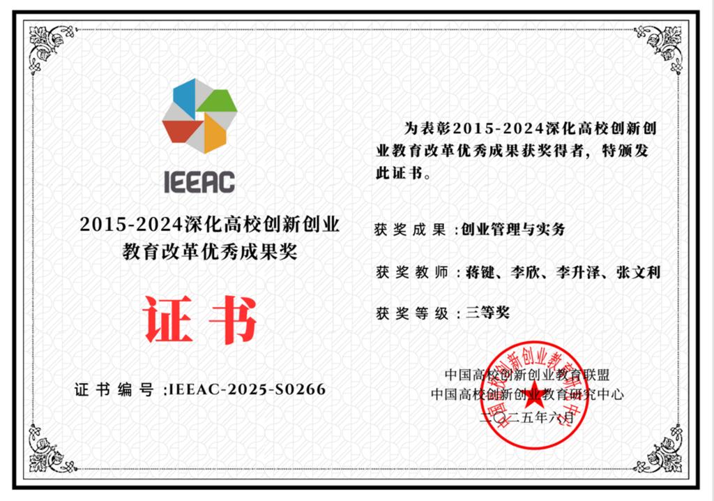6月24日,中国高校创新创业教育联盟公布了2015—2024年深化高校创新创业教育改革优秀成果评审结果,我校蒋键、李欣、李升泽、张文利四位老师编写的教材《创业管理与实务》荣获全国三等奖。据悉,本次评审由中国高校创新创业教育联盟与中国高校创新创业教育研究中心联合发起,面向全国高校征集,共收到来自清华大学、复旦大学、西安交通大学、华南理工大学等230所高校提交的869份成果申报材料,系统梳理和总结了2015-2024这十年间对中国高校创新创业教育深化改革有重大影响的标志性研究成果。